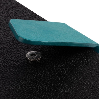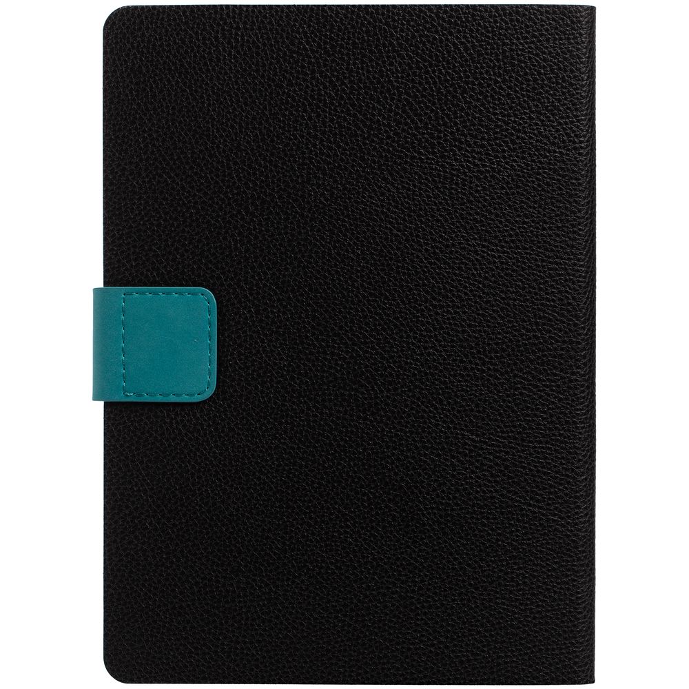 Ежедневник с гибкой обложкой, выполнен из материала La Fite, черный АА и Nubuck, цвет морской волны II, дополнен бирюзовым ляссе и хлястиком на кнопке.