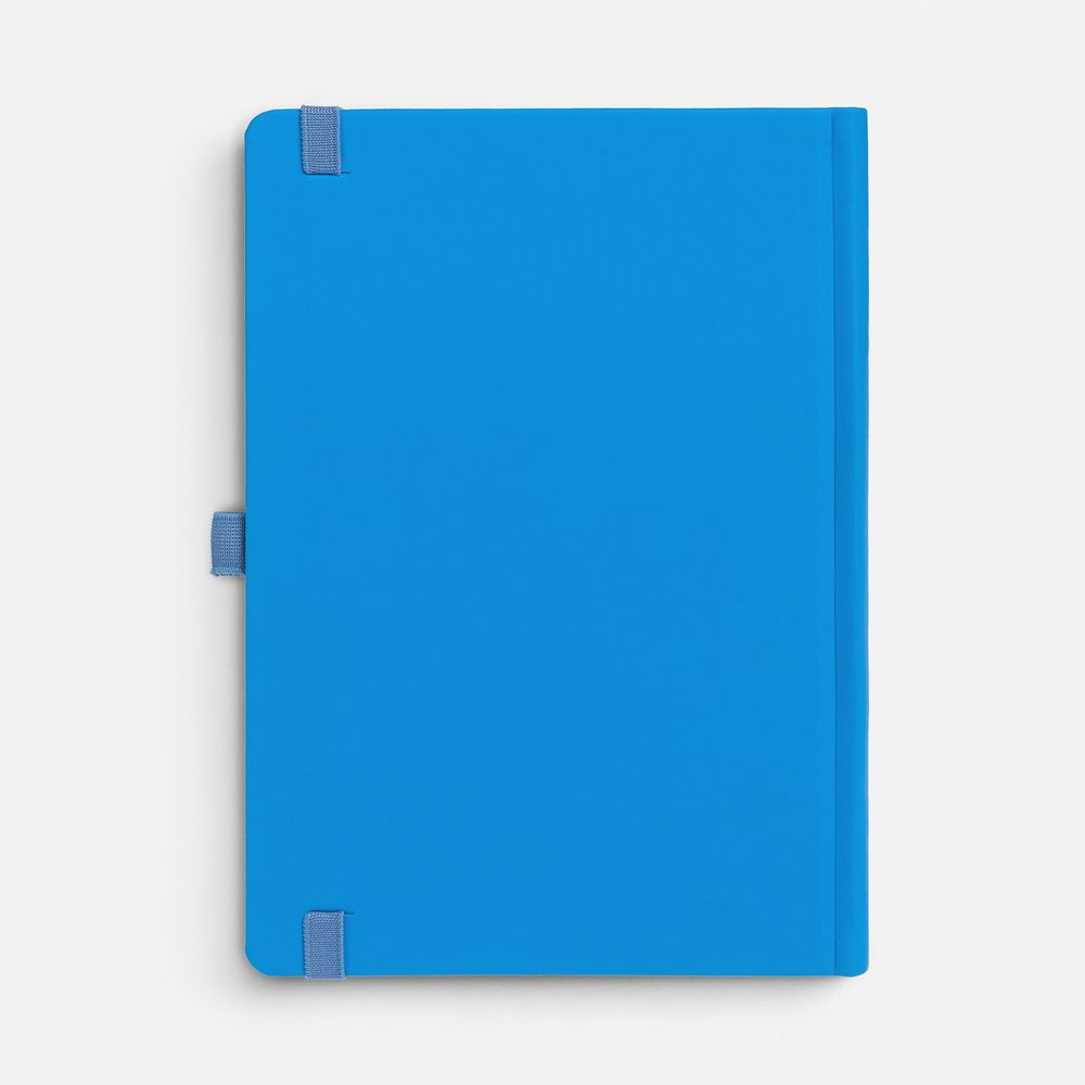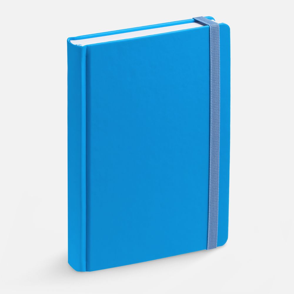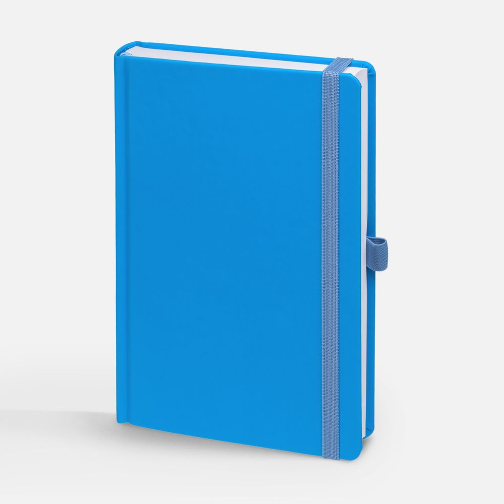 Ежедневник с твердой обложкой без поролона, выполнен из материала Soft Touch Ultra, голубой JJ, дополнен резинкой шириной 1 см, петлей-резинкой для ручки, капталом и ляссе голубого цвета.