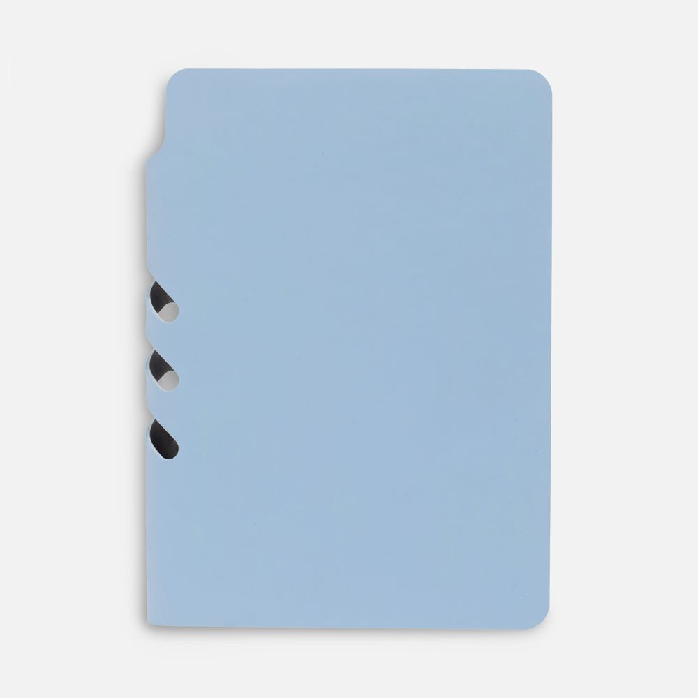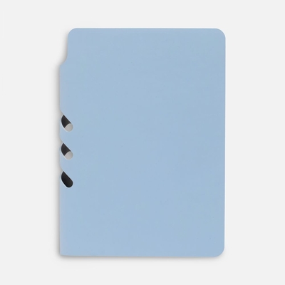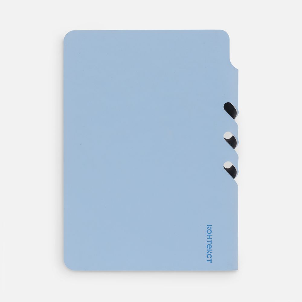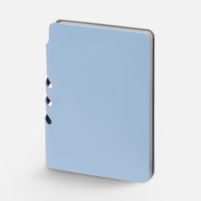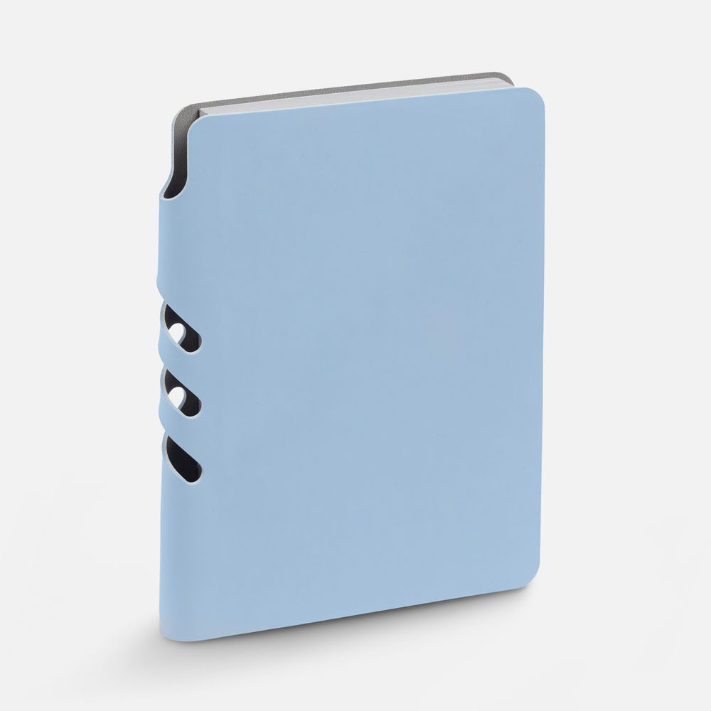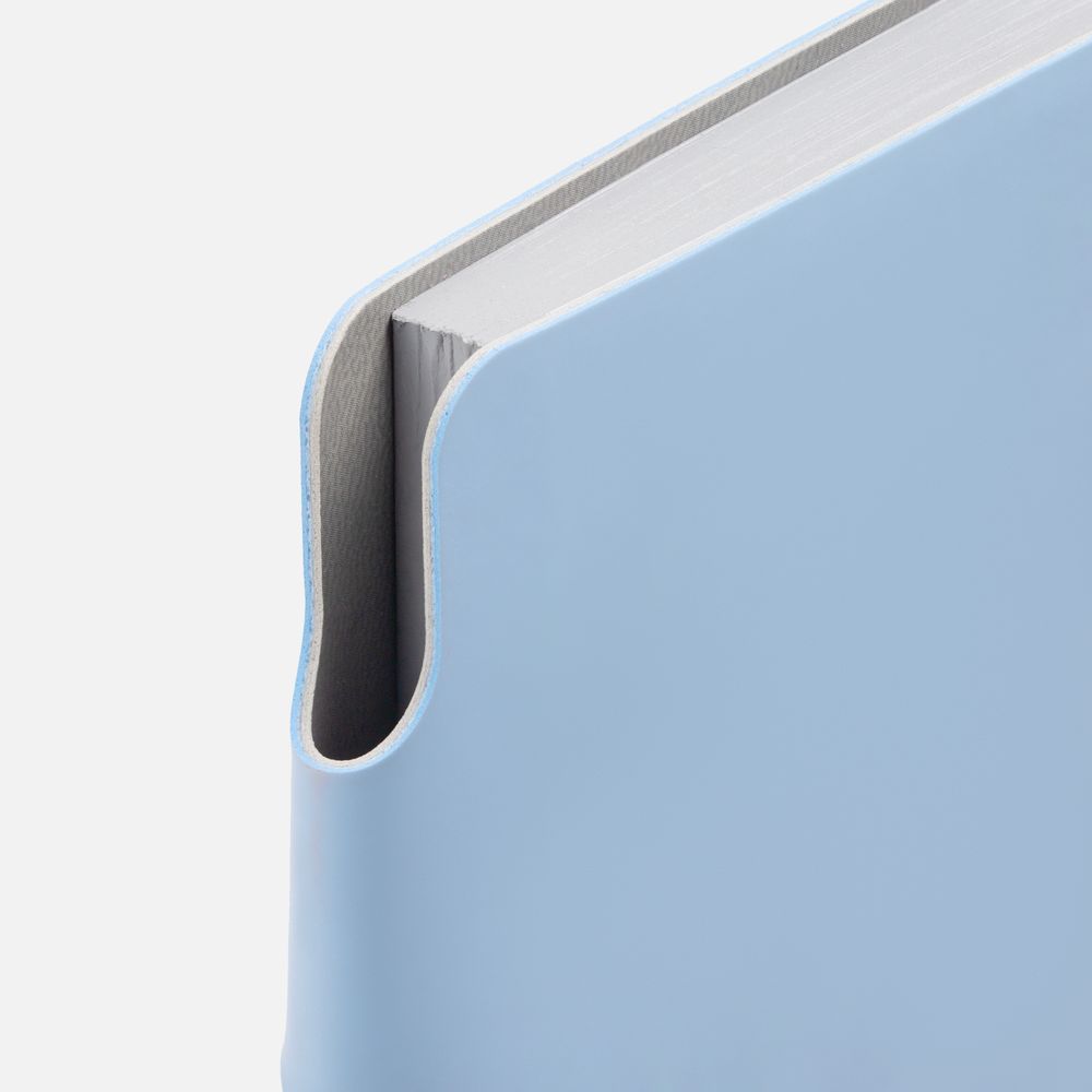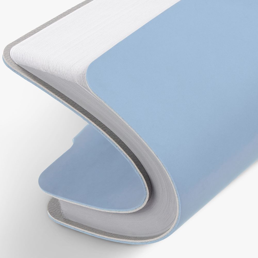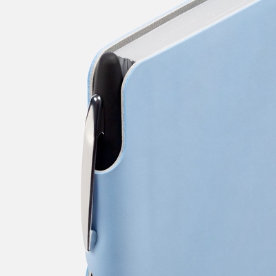 Ежедневник с гибкой обложкой выполнен из материала Soft Touch, голубой JJ и серого Latte (внутренняя часть обложки). Внутри корешка — специальное место для крепления ручки размером до 15х0,9 см.
