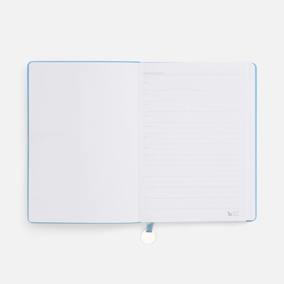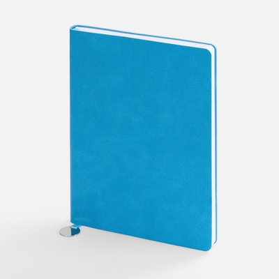 Ежедневник с гибкой обложкой, выполнен из материал La Fite, голубой JJ, дополнен ляссе в цвет обложки с металлическим шильдом.