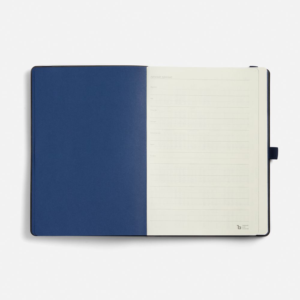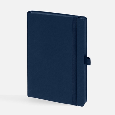 Ежедневник с гибкой обложкой, выполнен из материала Nice Touch, темно-синий ХХ, дополнен цветными ляссе и петлей-резинкой для ручки.