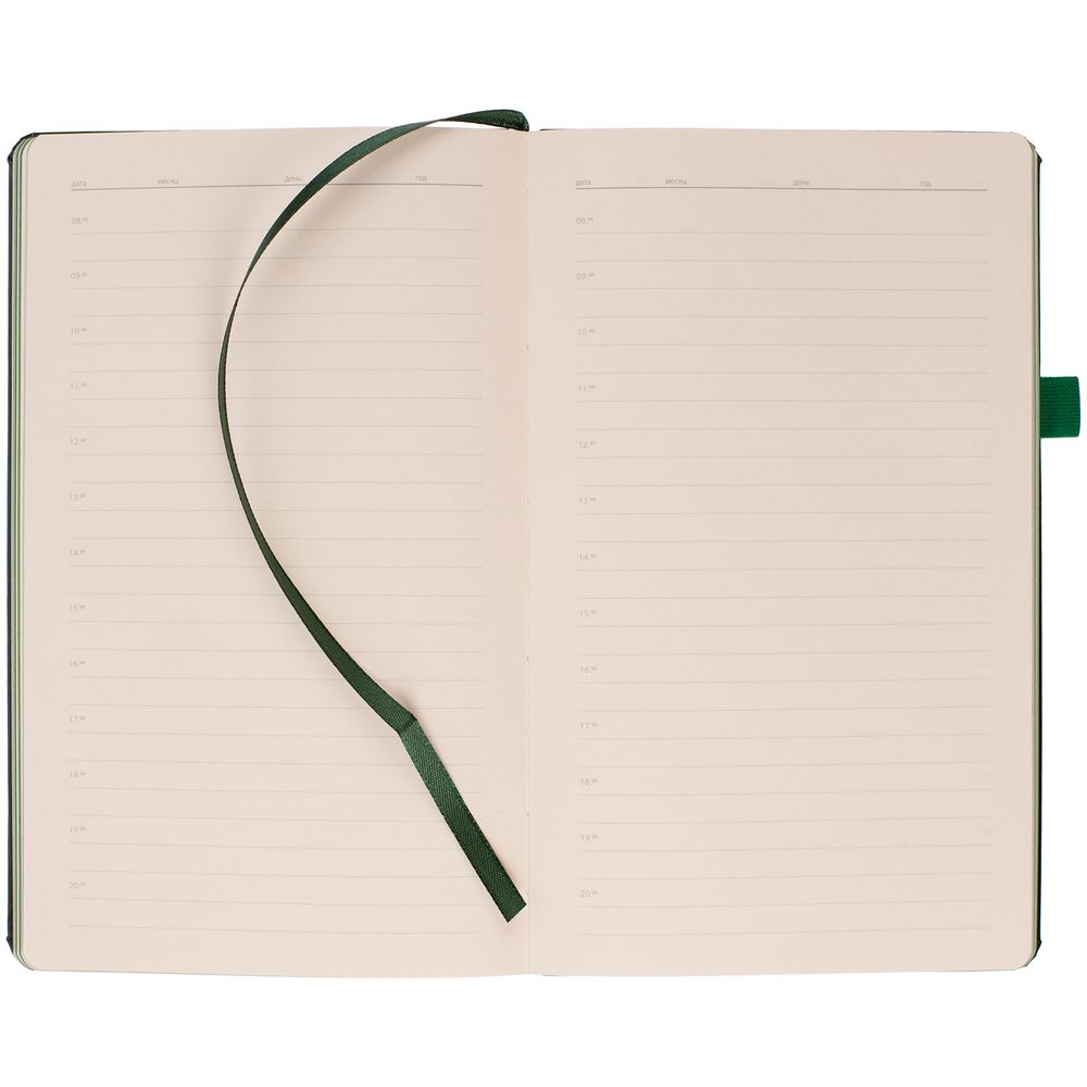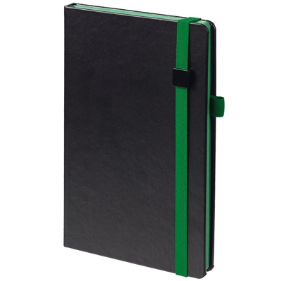Ежедневник с твердой обложкой, выполнен из материала Waltz, черный АА, дополнен зеленой резинкой с металлическим шильдом и ляссе.