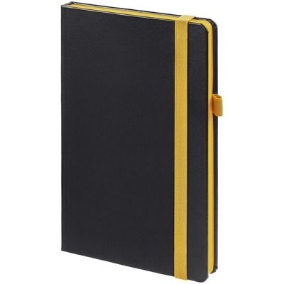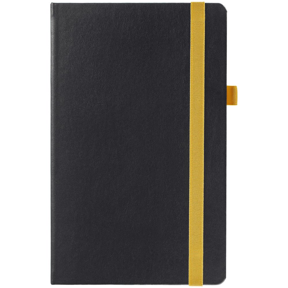 Ежедневник с твердой обложкой, выполнен из материала Waltz, черный АА, дополнен желтой резинкой и ляссе.