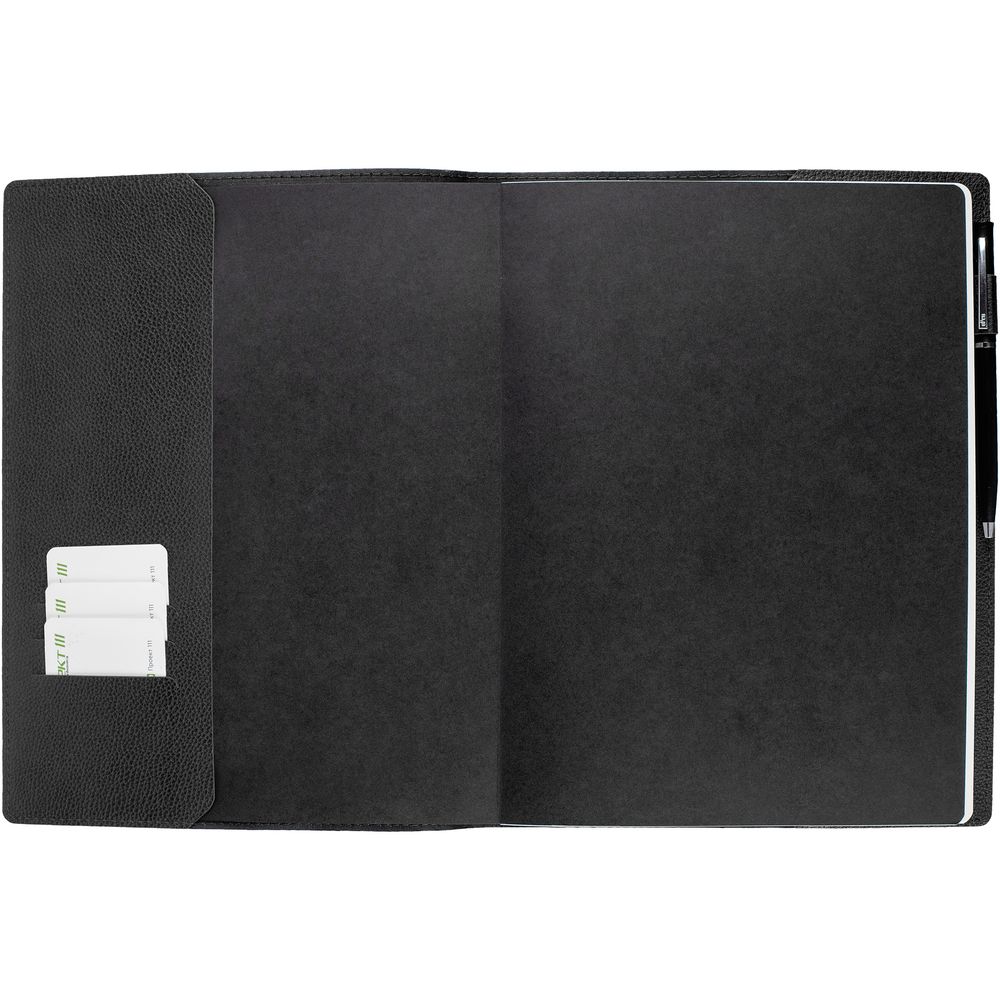 Ежедневник в суперобложке выполнен из материала La Fite, черный АА, дополнен ляссе и капталом черного цвета.