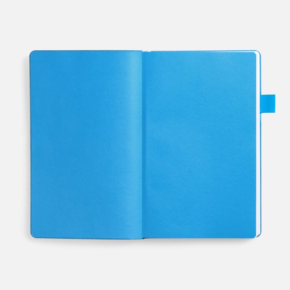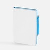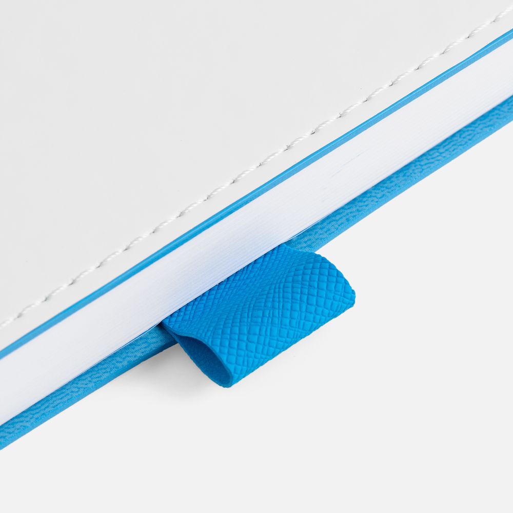 Гибкая обложка, материал обложки — Soft Touch, белый BB и Latte, голубойJJ; материал петли для ручки — Nice Touch, голубойJJ. Срез обложки окрашен в голубой цвет.