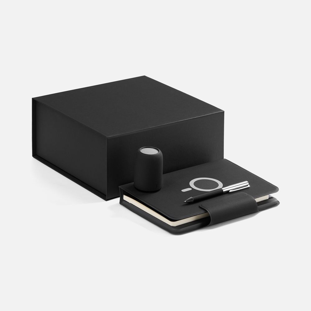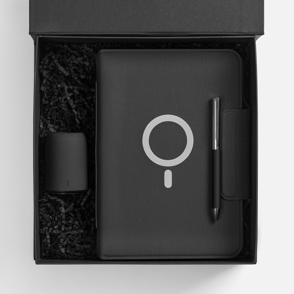 Oiro — премиальный подарочный набор для самых взыскательных пользователей, символ безупречного вкуса и практичности. Минималистичный стиль набора и его наполнение гармонично сочетают в себе классику и современность, технологичность и элегантность. Особое внимание уделено тактильным ощущениям: каждый предмет набора Oiro приятно держать в руках благодаря особенной, словно тканевой, фактуре.За музыкальную паузу отвечает компактная беспроводная колонка Uniscend Grinder, которая дает неожиданно яркий и достоверный звук. Отделка, имитирующая мягкую ткань, дарит приятные тактильные ощущения — приятный бонус для меломана.Особое удовольствие при письме дарит и софт-тач корпус приятно тяжелой металлической ручки Eyeshot Soft Touch в темно-синем цвете — современное прочтение классики. Центральное место в наборе, конечно, занимает органайзер Oiro с блокнотом, подставкой для смартфона и встроенным аккумулятором для беспроводной зарядки — практичное смарт-решение в организации рабочего процесса, где каждая деталь продумана для максимального комфорта и подлинного удовольствия.