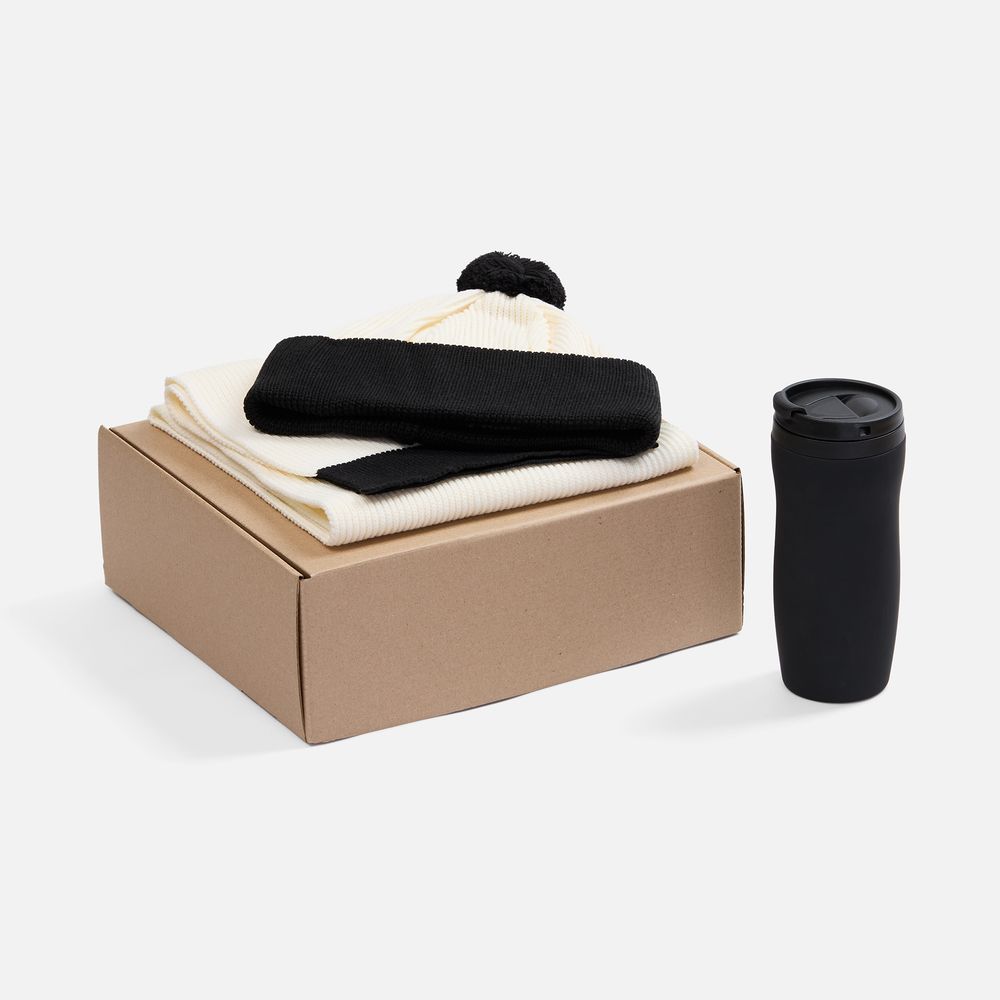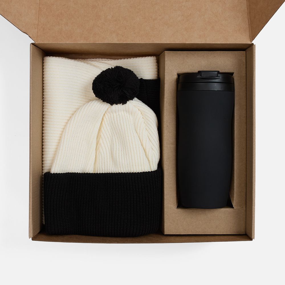 Материал шарф, шапка - акрил 100%; термостакан - нержавеющая сталь; покрытие софт-тач; крышка, внутренняя колба - пластик; коробка - микрогофрокартон, Т-23Е