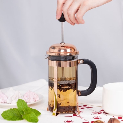 - Опустите пресс-фильтр: он плотно прижмет молотый кофе или чайные листья ко дну колбы и не даст им попасть в напиток.