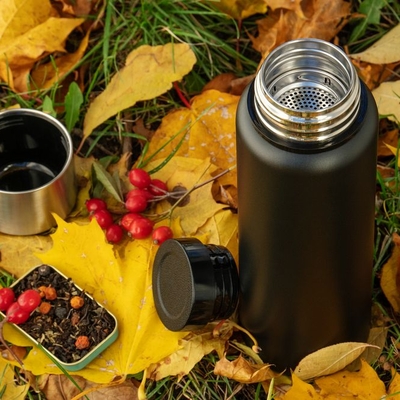 Двухслойная вакуумная конструкция из нержавеющей стали с завинчивающейся пробкой и ситечком.