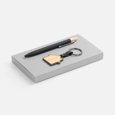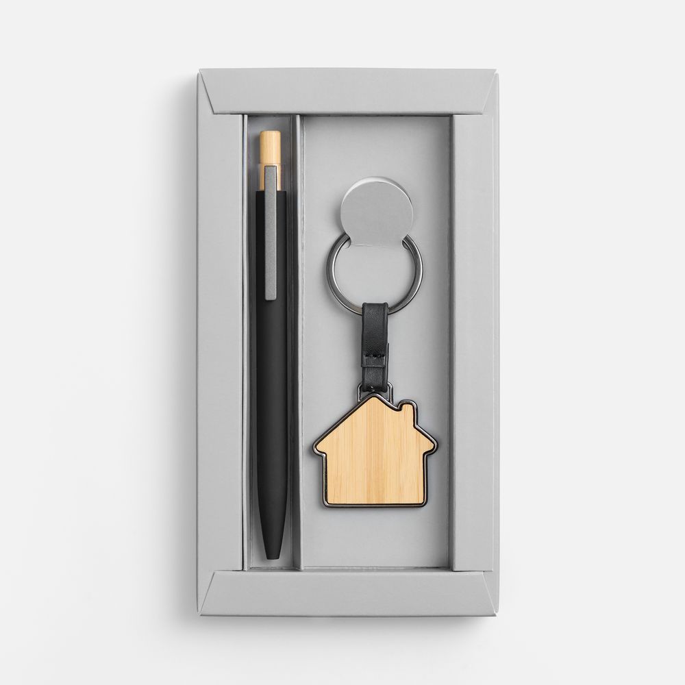 Материал брелок - металл; бамбук; ручка - металл, алюминий, кнопка - бамбук; коробка - картон