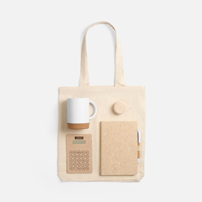 Материал блокнот - пробка; кружка - каменная керамика, подставка - пробка; калькулятор - картон; сумка - хлопок 100%, плотность 210 г/м²; саржа; игрушка-антистресс - дерево; ручка - пластик, пробка