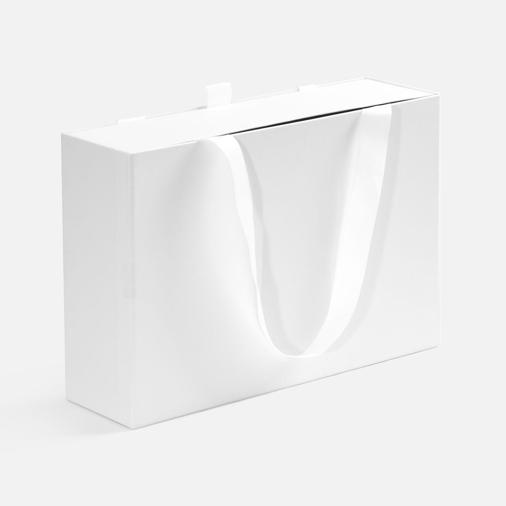 Внешний короб каширован дизайнерской бумаги и оснащен прочными ручками из репсовой ленты. Внутренний короб отделан белой бумагой, ламинированной матовой пленкой.